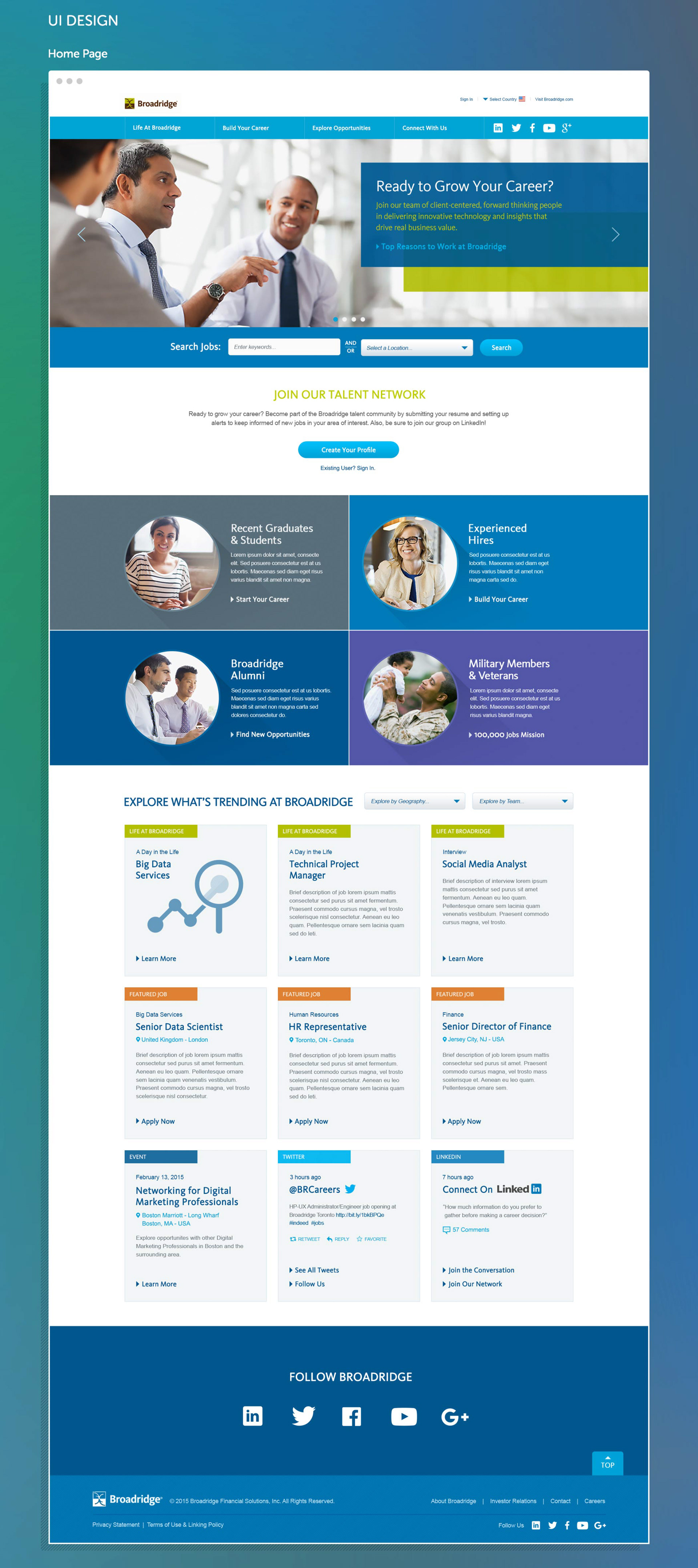The client wanted to increase new hires with their company, boost their social media presence, increase positive public perception and modernize their current careers web experience. Concurrently with the careers page redesign, the client was also redesigning their parent website (through another agency) so we had to take this into consideration with our designs and UX. Also, the client's global presence in the job market would need to be surfaced significantly on the career page.